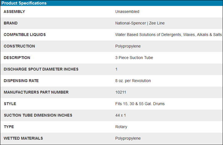 • Dispenses 8 oz. per revolution. Includes 2" bung adapter, 3 piece 1-1/4"dia. x 44"L suction tube with strainer and rotating 1" discharge spout